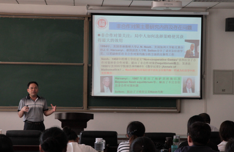 李登峰教授以“博弈是什么”引入报告主题,介绍了对策论,即是博弈论。然后对其两个方向发展:非合作对策与合作对策进行了介绍。其中着重介绍了合作对策的主要研究内容及存在的问题,多人合作对策存在的解,及最小均分原则确定分配方案。最后给出了合作对策今后需要着重研究的主要问题。