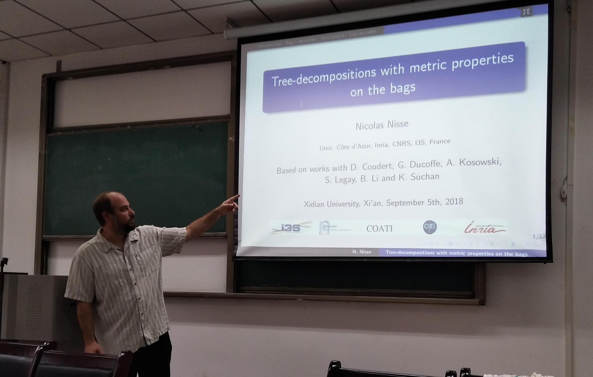 应太阳集团tyc539李碧博士邀请,法国信息与自动化研究所(Inria) Nicolas NISSE教授于2018年9月2日-15日来公司交流访问,与公司相关师生进行了亲切友好的座谈。并分别于9月5日和12日作题为“Tree decompositions with metric properties on bags”和“Recovery of disrupted airline operations using k-Maximum Matching in graphs”的学术报告,报告会在信远楼II区206会议室举行,报告会由李碧博士主持,共30多名师生参加了报告会。