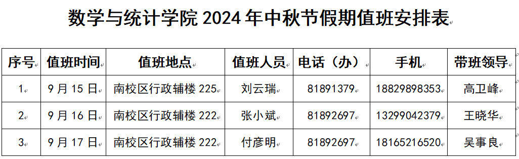 2024年中秋节假期值班安排表