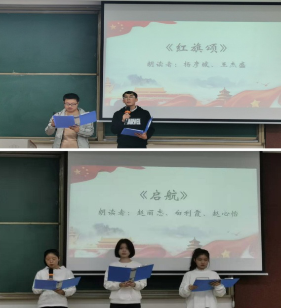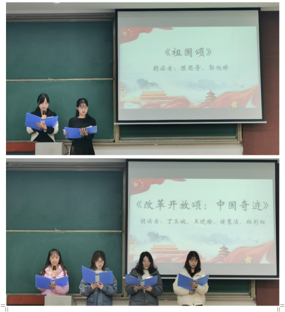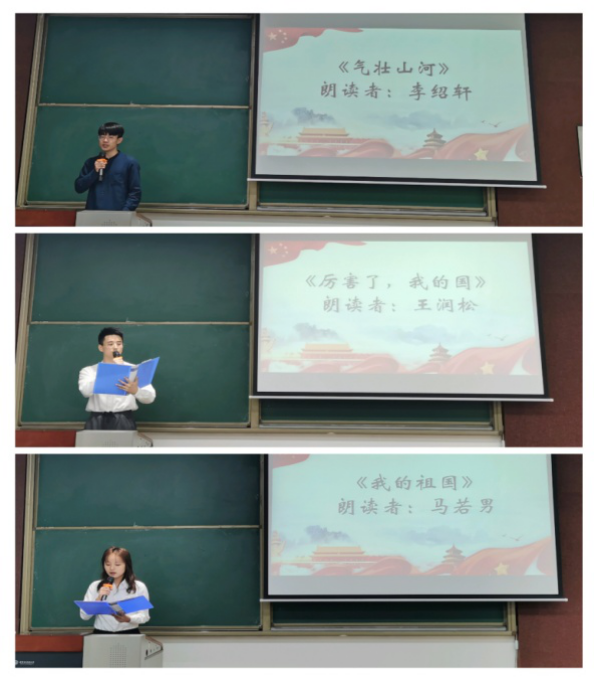 在主持人宣读完比赛规则及评分细则后,朗诵比赛正式拉开帷幕。首先进行的是个人赛,参赛选手们一个个仪态端庄,感情充沛,语气或轻缓或激昂。选手马若男朗诵的《我的祖国》抒发了自己的爱国热情,歌颂祖国源远流长的历史和人民坚韧执着的性格;选手申金顺朗诵的《长征》带领着现场观众走进那段难以忘怀艰难而又充满力量的长征岁月;选手关畅畅朗诵的《歌颂中国共产党》回望了在党领导下,中国一步步发展走向世界的历史,中华不屈的信念在中华儿女的心中生根发芽。还有选手李绍轩、王润松、刘汶霖也结合新中国的发展历程表达了对祖国深深的热爱,参赛选手们的出色表现获得现场观众们的阵阵掌声,得到了评委们的一致肯定。