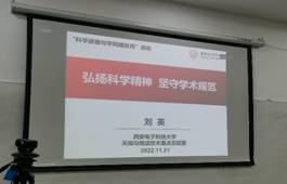 刘英教授的报告主题是“弘扬科学精神坚守学术规范”,她首先通过钱学森、保铮、南仁东等一系列科学家和院士的真实事迹向大家解读新时代科学家精神,其重要内涵为:胸怀祖国、服务人民的爱国精神;勇攀高峰、敢为人先的创新精神;追求真理、严谨治学的求实精神;淡泊名利、潜心研究的奉献精神;集智攻关、团结协作的协同精神;甘为人梯、奖掖后学的育人精神。其次,刘英教授仔细介绍了学术规范的基本准则,对其中重要规范做出详细说明,并用大量真实案例告诫同学们应坚决拒绝学术不端的行为。