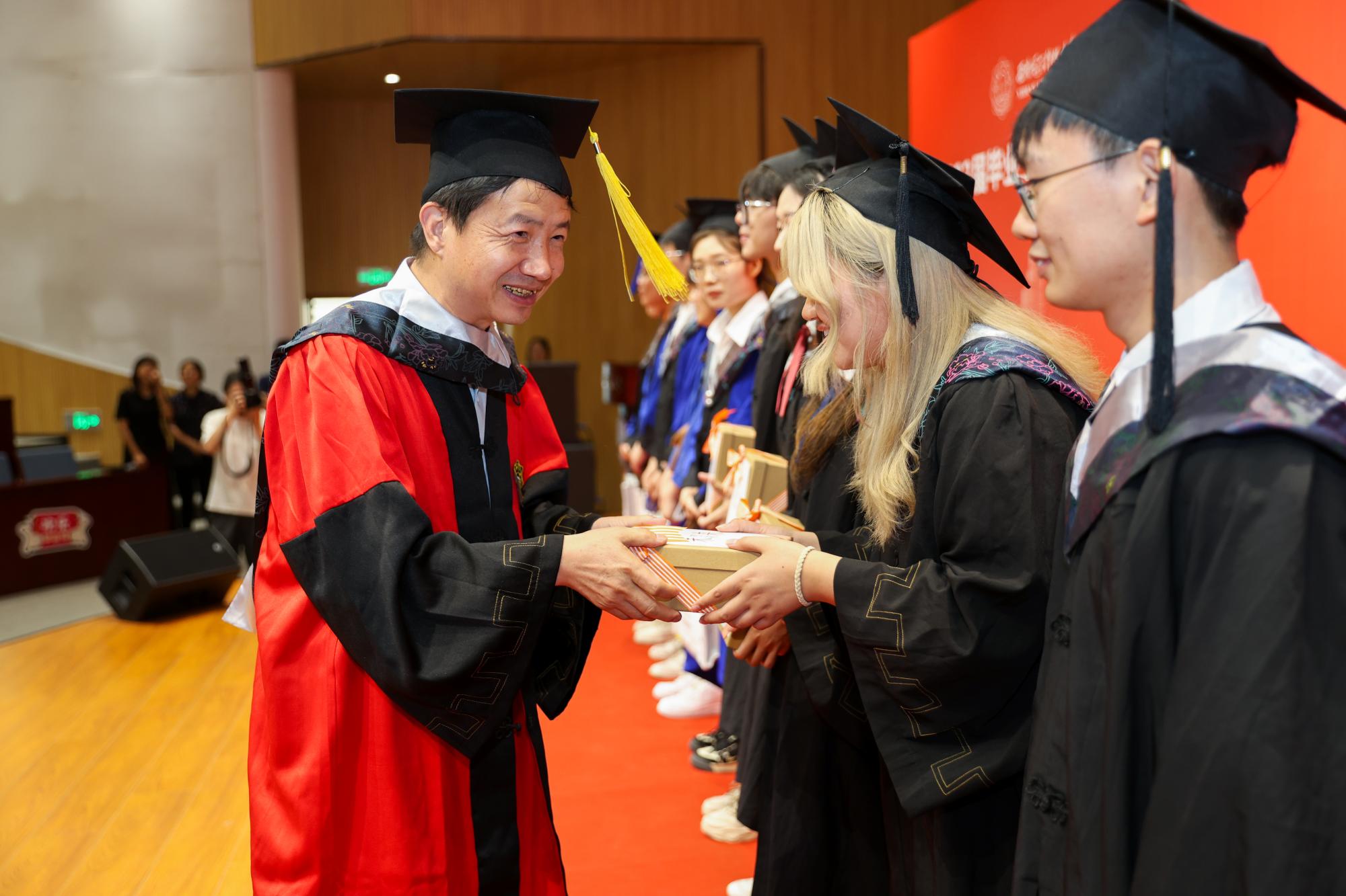 授位仪式上,副董事长王泉教授、公司经理马如云教授、副经理杨有龙教授、副经理吴事良教授分别为毕业生们一一拨穗授位,颁发学位证书。同学们依次上台向授位导师鞠躬致敬,接过证书,并留下合影。同时公司还为毕业生们准备了很多具有纪念意义的名为“未来”的毕业礼物。