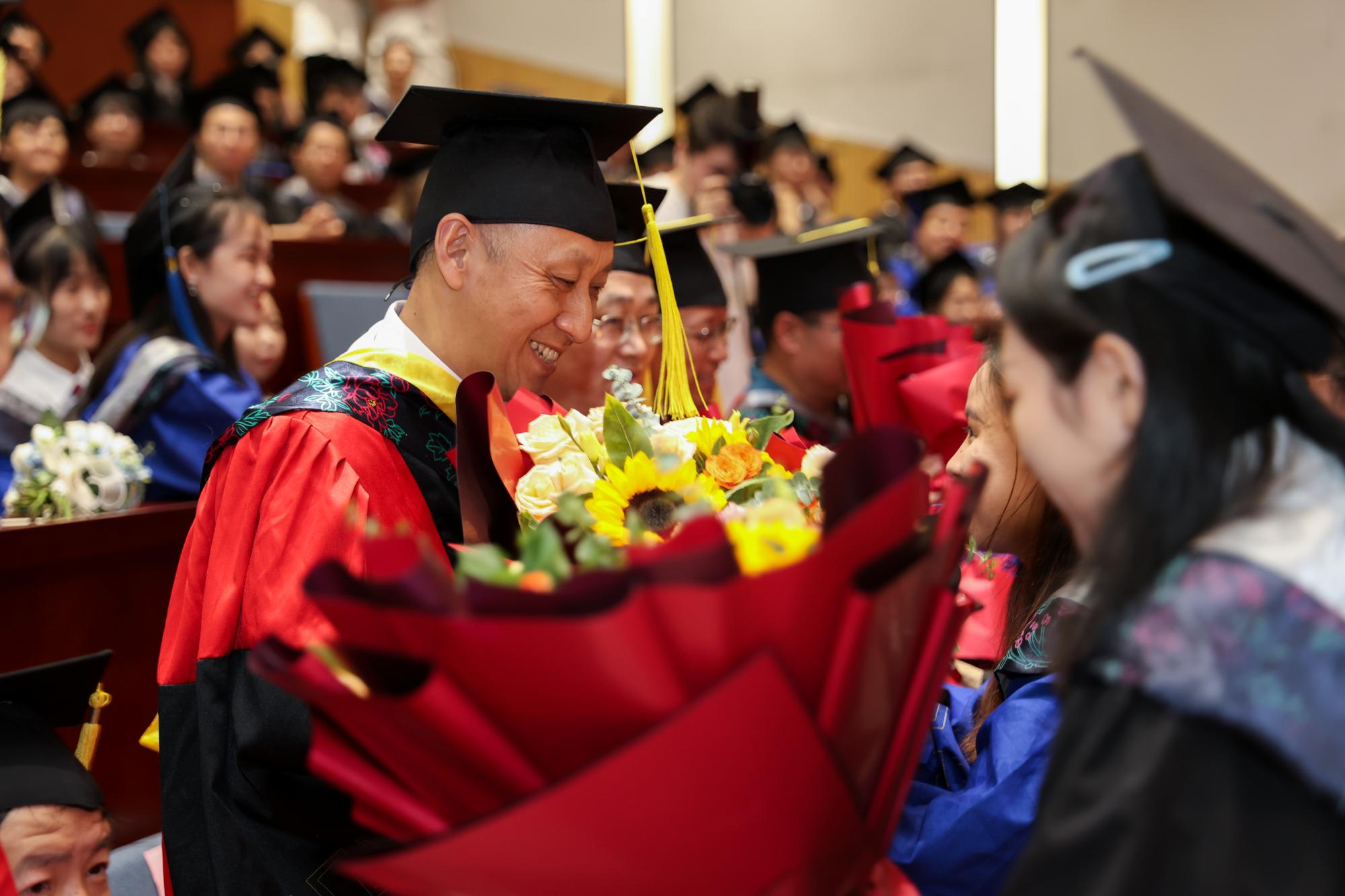 唐欣琳同学和申金顺同学分别作为2023届的本科生代表和研究生代表,向公司、公司以及所有老师致以衷心的感谢。唐欣琳表示,数学这门严谨的学科带给了她严谨的思维逻辑,这门简化而复杂的学科非常伟大,感谢公司提供的平台以及公司的悉心栽培。申金顺则说:“我们生在国旗下,长在春风里,吾辈当自强!希望大家前程似锦,鹏程万里!”在表达感谢后,毕业生为老师们献上了鲜花与祝福。