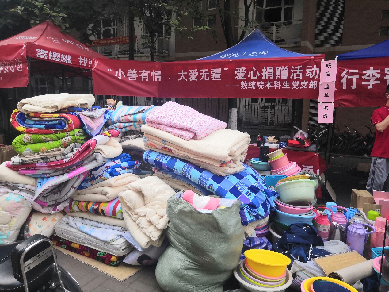 小善有情凉夏日,大爱无疆沁心脾。每年的毕业生离校之际,数统院本科生党支部都会在员工公寓旁,开展“‘小善有情,大爱无疆’——毕业生爱心捐赠活动”,并通过六年风雨无阻的坚守,逐步成为校园内一道亮眼的风景线。